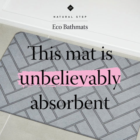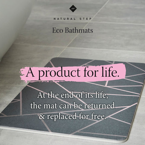 Most bath mats are cotton or synthetic cotton, with a rubber back and need machine washing and drying regularly. This takes considerable energy and creates carbon emissions. Natural Step mats are wipe clean. At the end of their life the cotton/rubber materials can't be separated so recycling isn't possible and the mats end up in landfill. Cotton and rubber both have a high carbon footprint and wider environmental impact around soil erosion and use of fossil fuels.